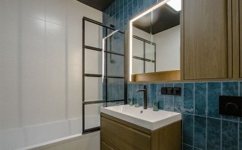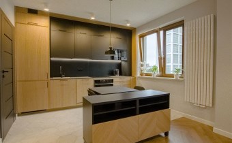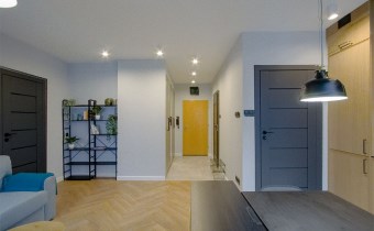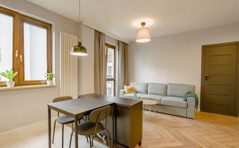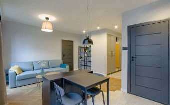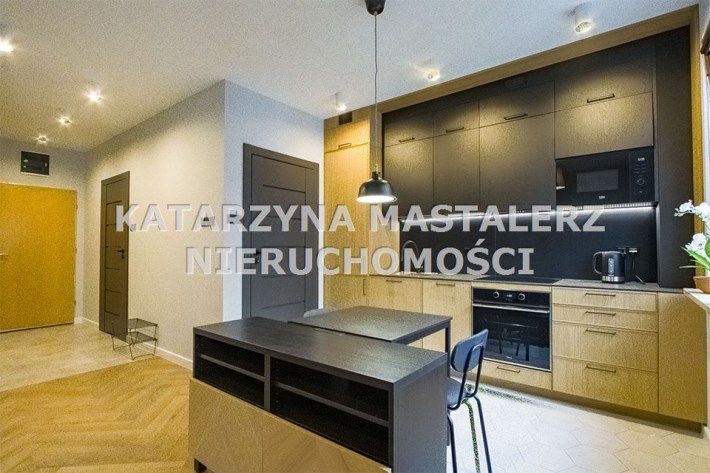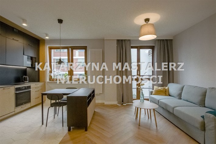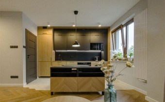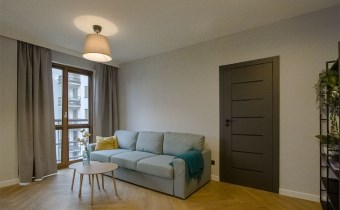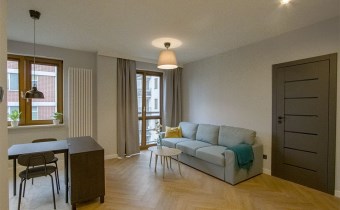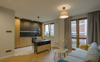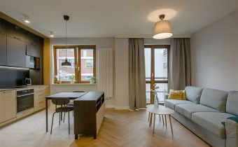 - Mieszkania składa się z: przestronnego salonu z aneksem kuchennym, spiżarni, sypialni, łazienki oraz przedpokoju. Do mieszkania przynależy miejsce postojowe w garażu podziemnym. Apartament w wysokim standardzie wykończenia ze szczególną dbałością o każdy detal, w lekkim i nowoczesnym stylu, ciekawe elementy wystroju, kolorystyka wnętrza została utrzymana w jasnej tonacji w pięknym stylu. Wyposażony w sprzęty i meble, całość prezentuje się niezwykle efektownie. Kuchnia wyposażona w sprzęt AGD (płyta indukcyjna, zmywarka, piekarnik, lodówka, mikrofala, okap, meble w zabudowie). Na podłodze panele podłogowe o wysokiej klasie ścieralności, w łazience gres. Sypialnia z dużym wygodnym łożem małżeńskim. W łazience wanna.